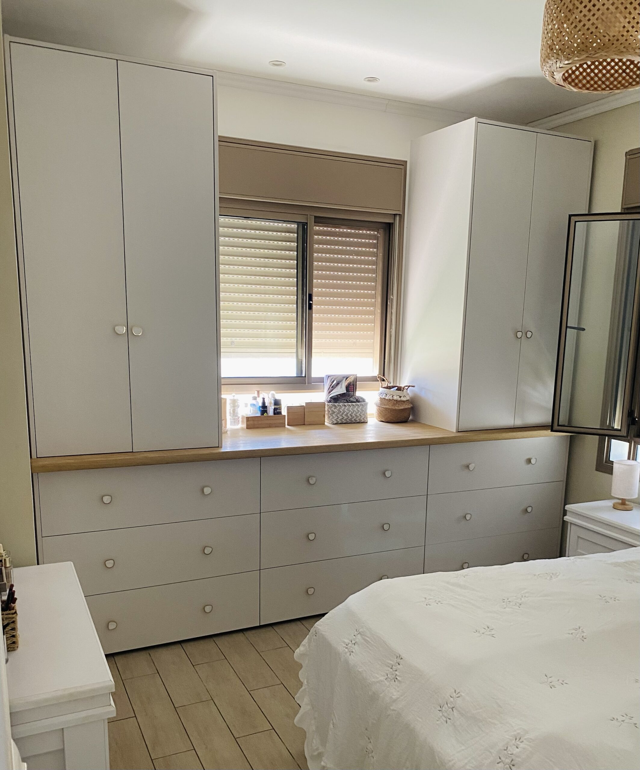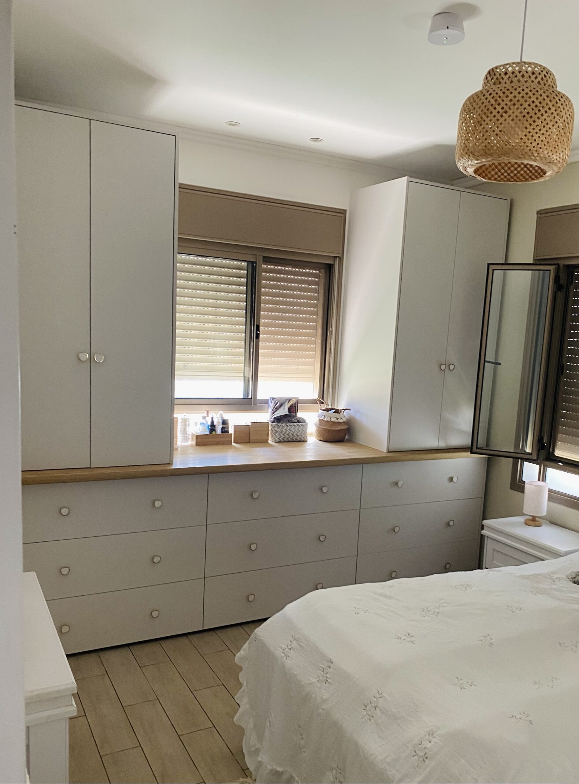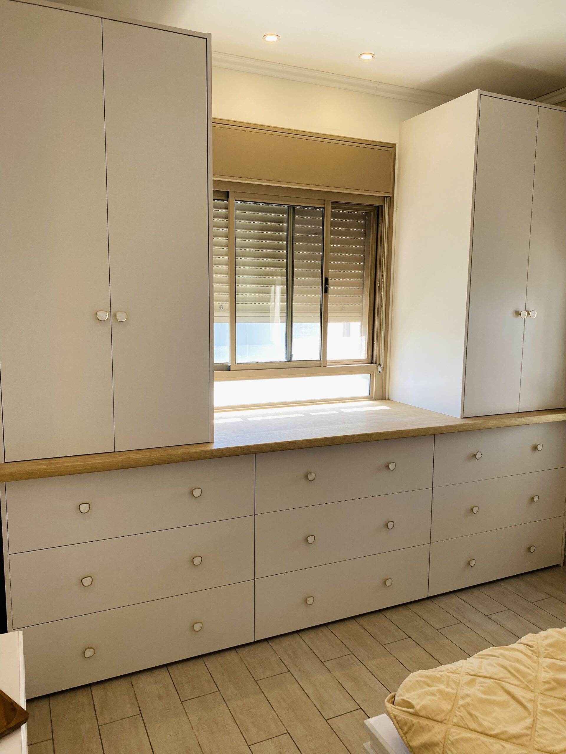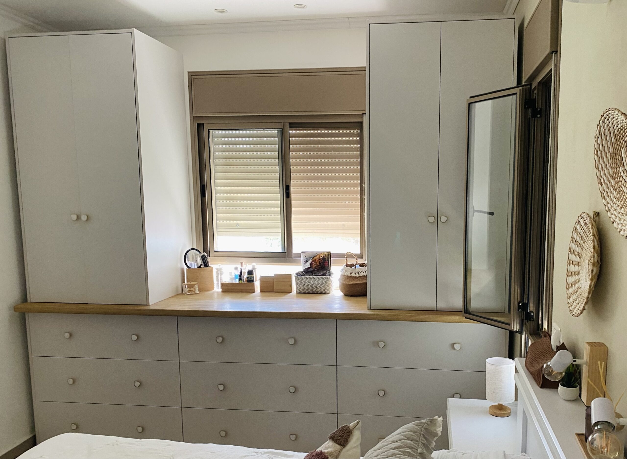 השילוב של שולחן עץ מלא מאגוז אפריקאי תחת החלון יוצר מקום נעים לכתיבה, התרעננות ונגישות. ביחד עם ארונות תלייה בצידי השידה יש מקום להכיל ביגוד לגבר ולאישה בחדרים בהם אין אפשרות לחדר ארונות מלא ביחד עם שמירה על עיצוב נעים ורך לחדר שינה.